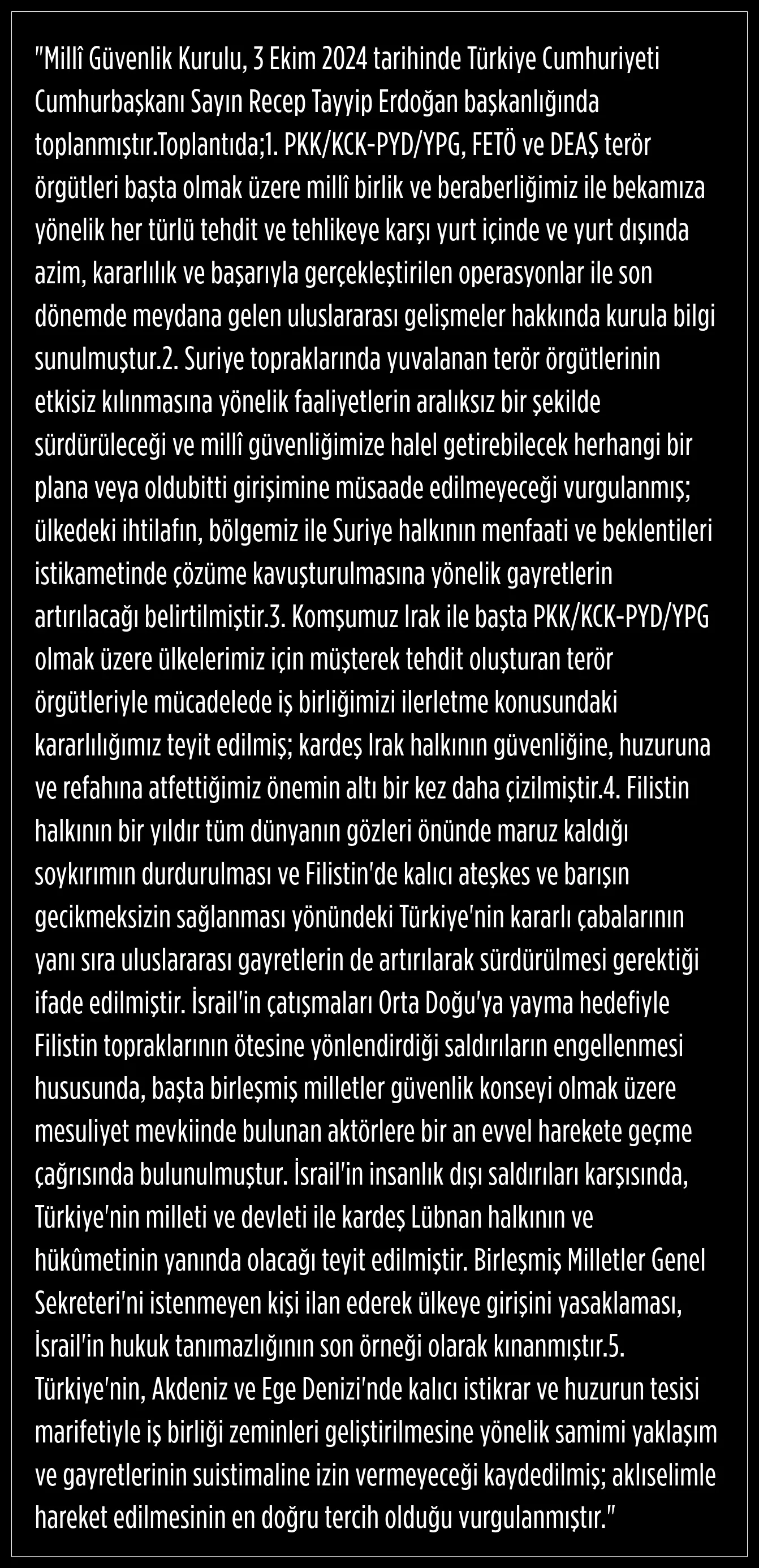 Cumhurbaşkanı Erdoğan’ın başkanlık ettiği MGK toplantısından 5 maddelik bildiri çıktı. Bildiride İsrail ile ilgili madde dikkat çekti.