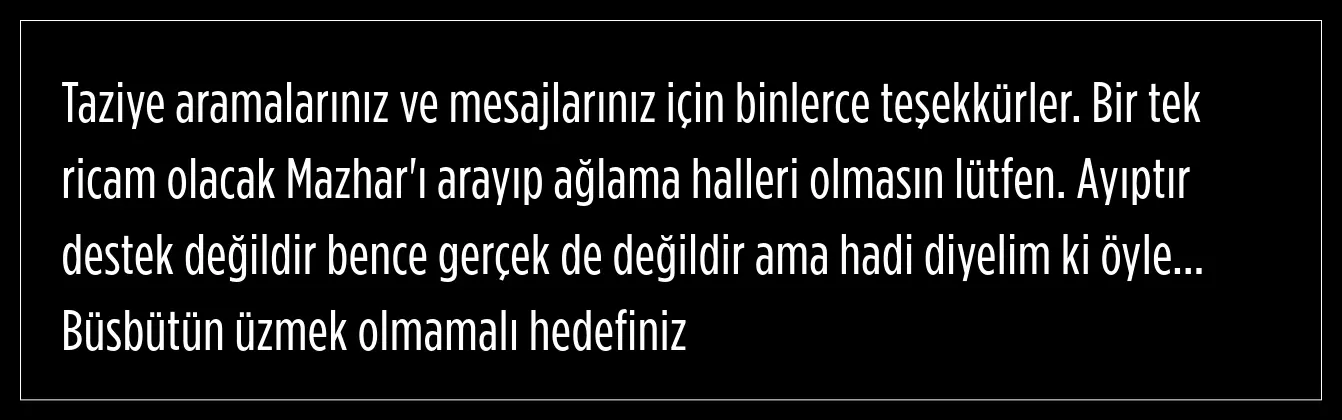 Taziyelerini ileten Mazhar Alanson'un eşi Biricik Suden, sosyal medya hesabındaki paylaşıma ilişkin şu ifadeleri kullandı;