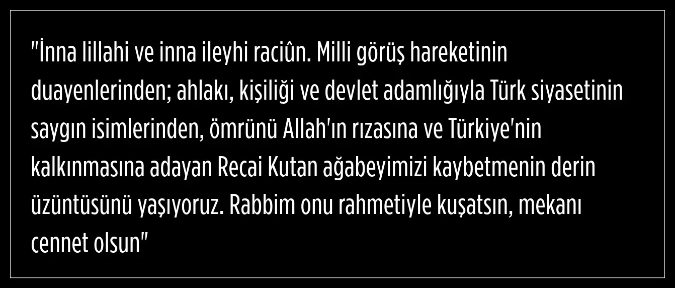 Saadet Partisi resmi sosyal medya hesabından paylaşılan mesajda; Saadet Partisi Kurucu Genel Başkanı Recai Kutan'ın hayata gözlerini yumduğunu duyurdu.