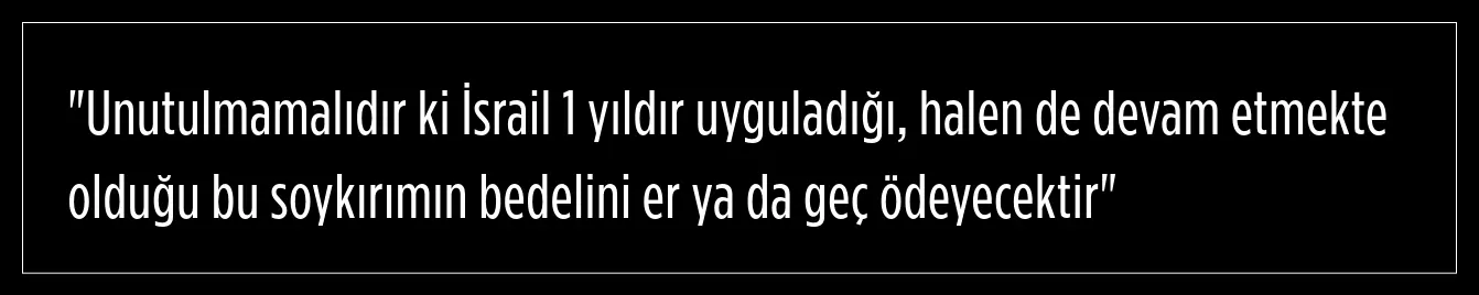Cumhurbaşkanı Erdoğan, İsrail'in Filistin halkına yönelik saldırılarının bir yıldır sürdüğünü hatırlatarak, bu "soykırımın bedelini" İsrail’in er ya da geç ödeyeceğini belirtti. Erdoğan, bu tür insan hakları ihlallerinin cezasız kalmayacağını ifade etti.