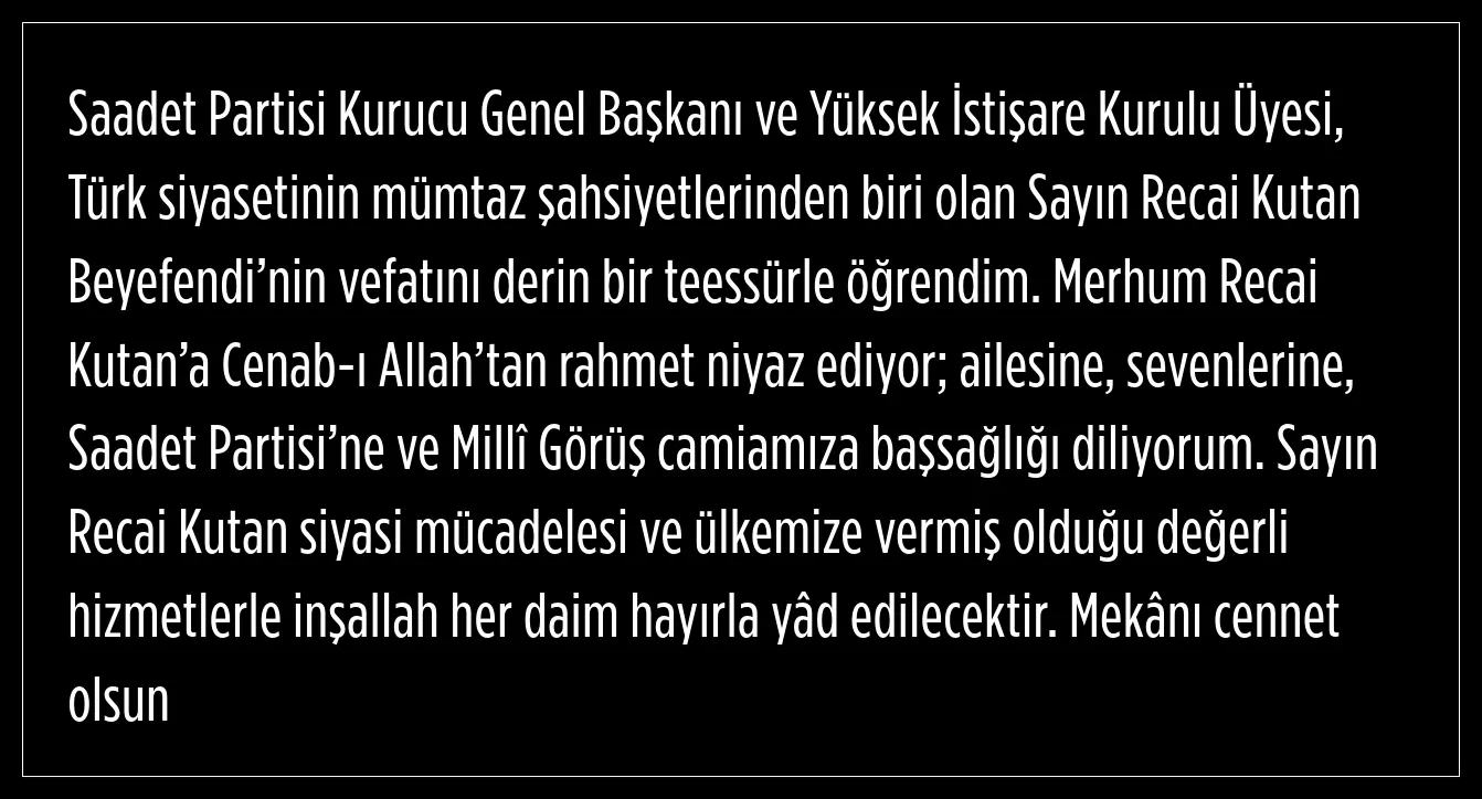 Cumhurbaşkanı Erdoğan, Saadet Partisi Kurucu Genel Başkanı ve Yüksek İstişare Kurulu Üyesi, Türk siyasetinin mümtaz şahsiyetlerinden biri olan Recai Kutan'ın vefatını derin bir teessürle öğrendiğini ifade etti.