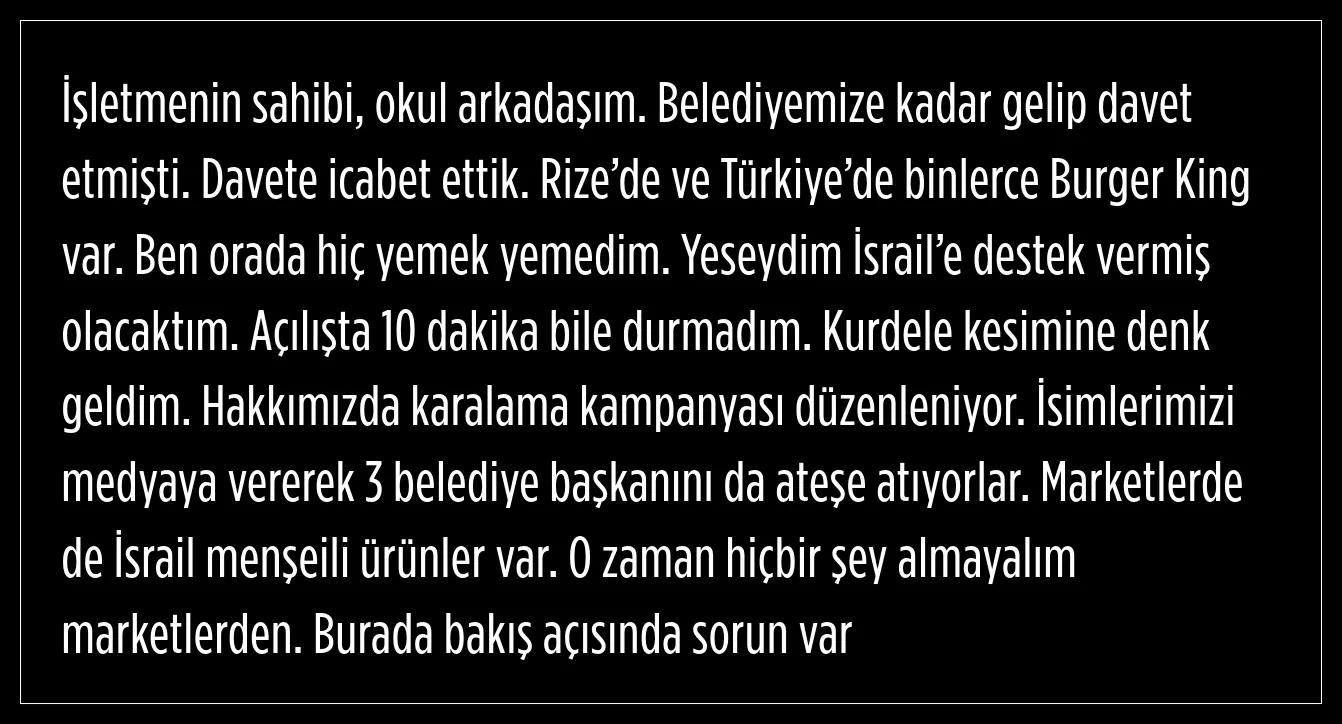 İyidere Belediye Başkanı Saffet Mete, Burger King'ten hiç yemek yemediğini ifade ederek, "Yeseydim İsrail’e destek vermiş olacaktım" dedi.