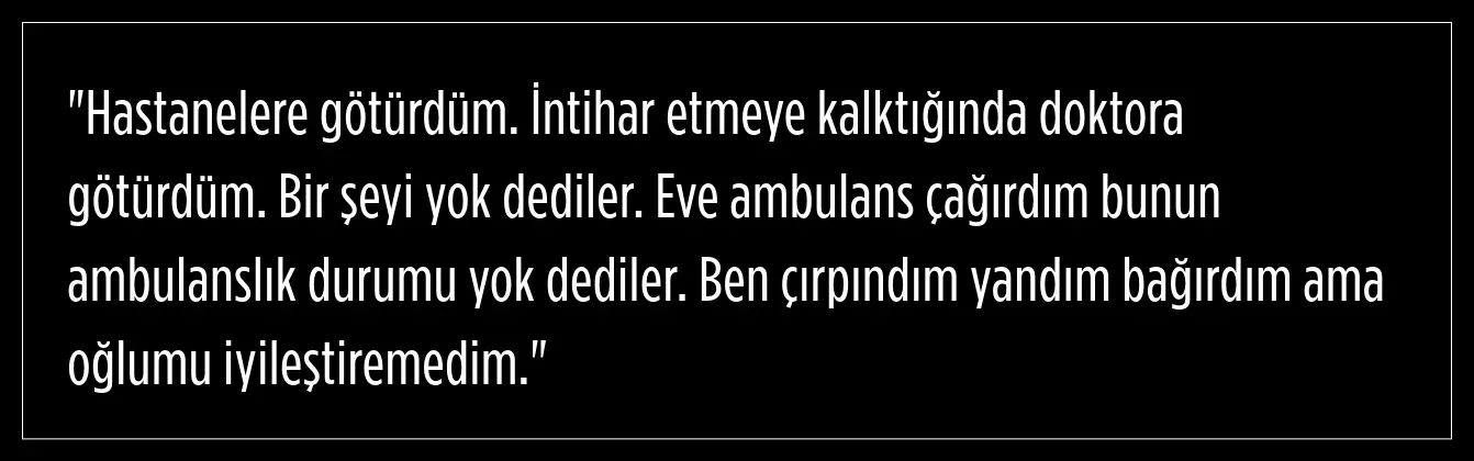 "Ben çok büyük acı çekiyorum evladım günlerdir toprakta ama ben o kızlar için üzülüyorum çaresiz kaldım. Oğlumun sorununu çözemedim, intihara meyilliydi keşke sadece kendi gitseydi."