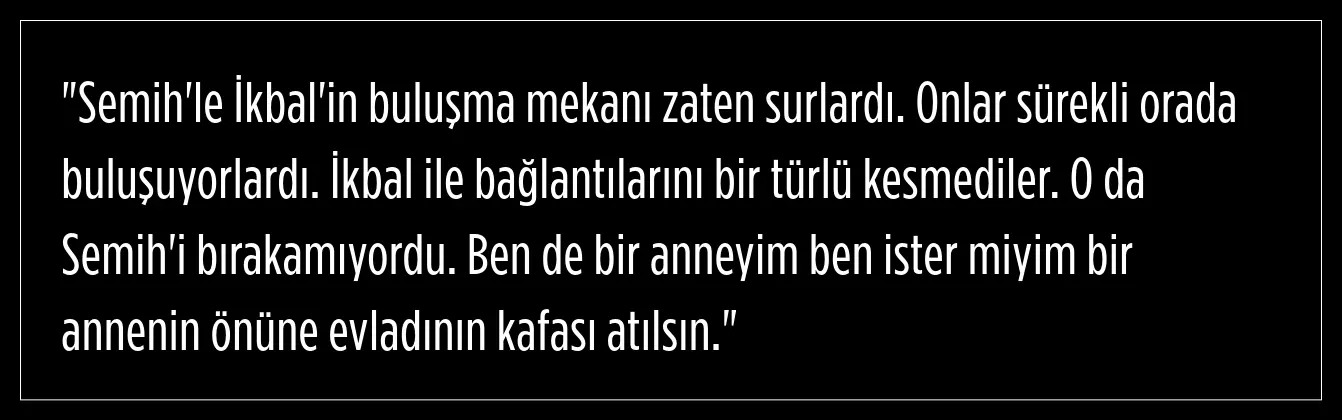 Semih Çelik'in annesi, surların oğlu ve İkbal'in devamlı buluşma mekanı olduğunu ifade etti.