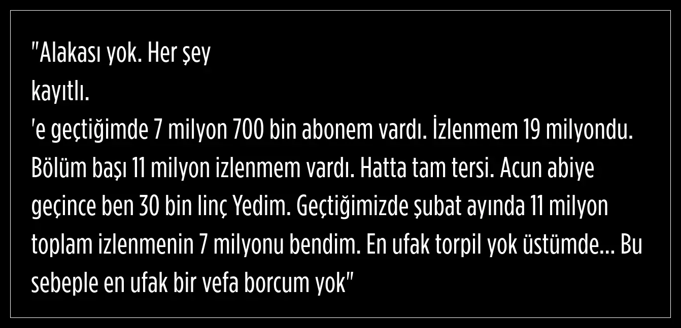 Hasan Can Kaya, Acun Ilıcalı’ya bir vefa borcu olmadığını belirterek geçen şubattaki 11 milyon izlenmenin 7 milyonun kendisine ait olduğunu söyledi.