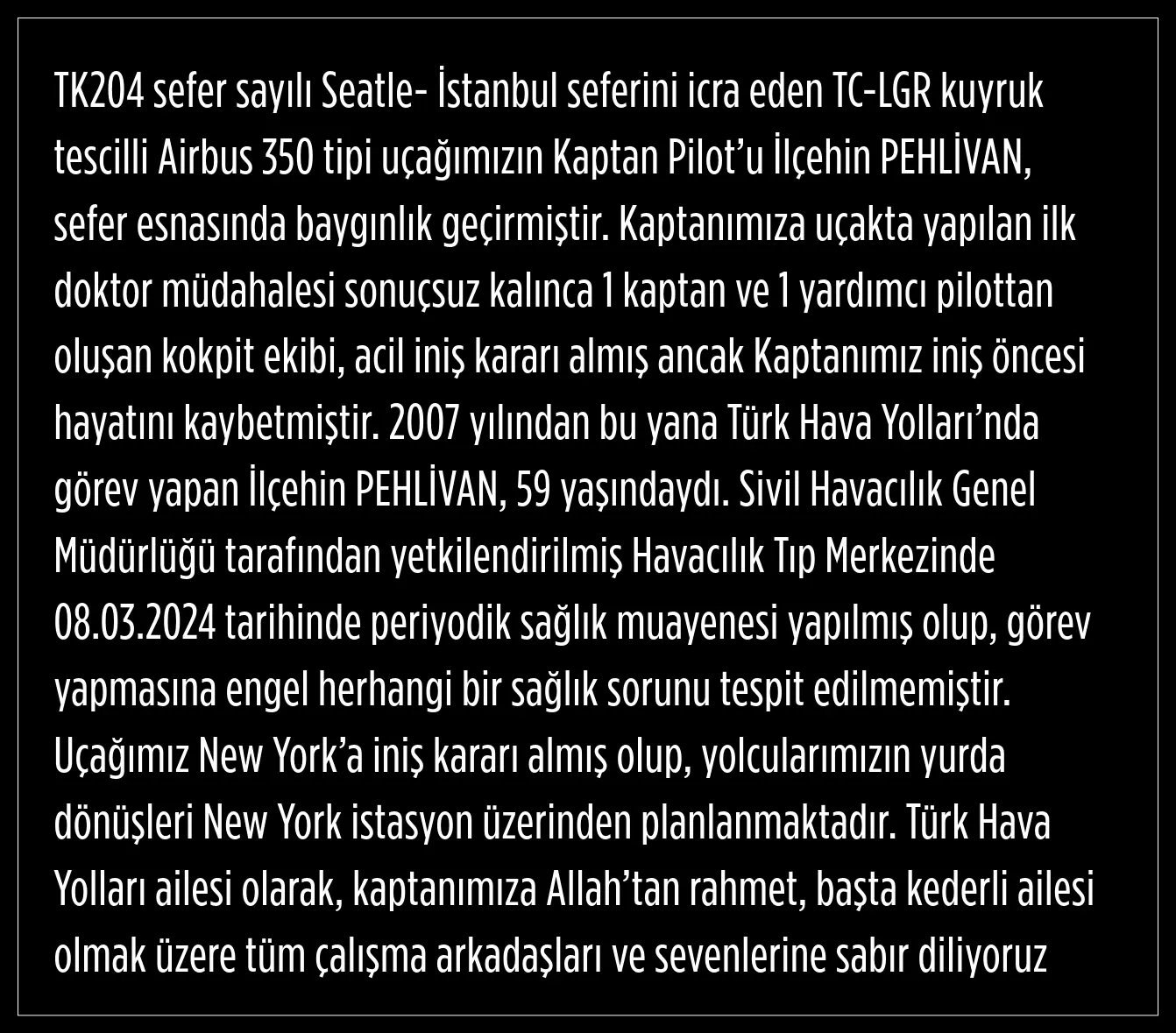 Yahya Üstün, Seatle- İstanbul seferini icra eden TC-LGR kuyruk tescilli Airbus 350 tipi uçağın kaptan pilotu İlçehin Pehlivan'ın sefer esnasında baygınlık geçirdiğini ifade etti.