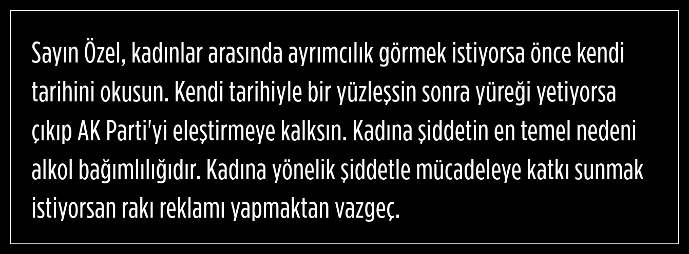 İstanbul Sözleşmesi üzerinden muhalefete seslenen Cumhurbaşkanı Erdoğan, Özgür Özel'e tepki gösterdi. Kadın hakları konusunda muhalefetin kendilerine ders veremeyeceğini belirten Cumhurbaşkanın ve AK Parti Genel Başkanı Recep Tayyip Erdoğan, Özel'in kendi tarihi araştırması gerektiğini belirtti.
