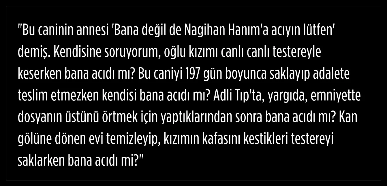 "Oğlu kızımı canlı canlı testereyle keserken bana acıdı mı?” diye soran anne Karabulut, “Kimse bana o caninin öldüğünü iddia etmesin" sözleriyle DNA raporlarına da güvenmediğini ortaya koydu.
