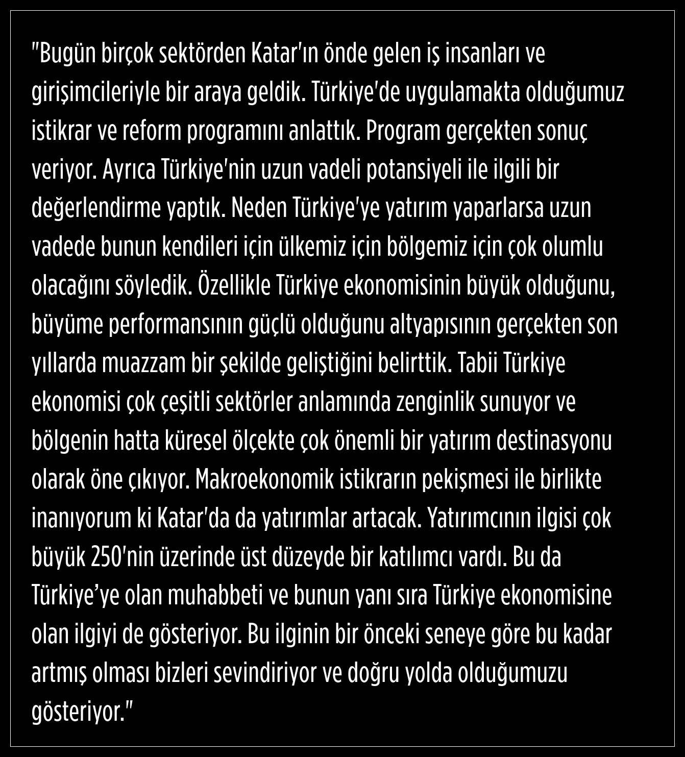 Yeni ekonomi politikalarının hedeflerini ve Orta Vadeli Program'daki reformları anlatan Bakan, Katarlı iş insanlarına Türkiye’nin ekonomik fırsatlarını tanıttı. Türkiye’nin yatırım açısından stratejik avantajlarını ve sürdürülebilir büyüme hedeflerini ele alarak, Katarlı yatırımcılara ülkenin uzun vadeli potansiyelini değerlendirme çağrısında bulundu.