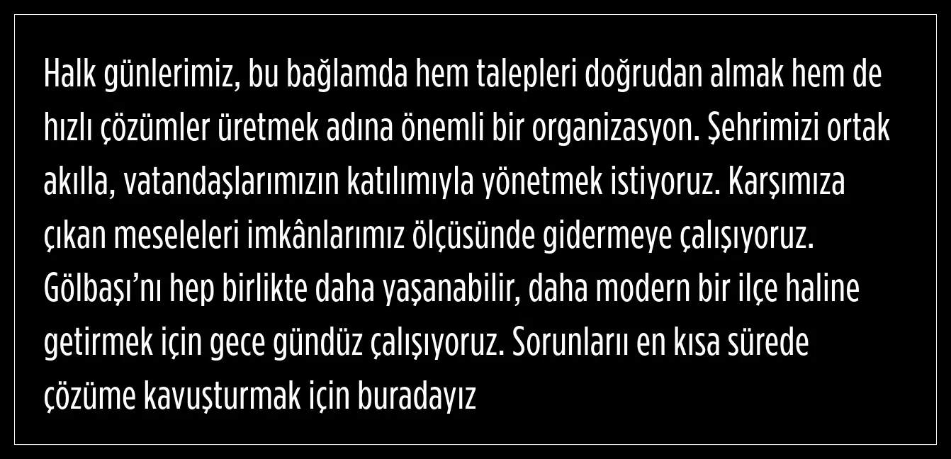 Her çarşamba düzenlenen halk günleri saat 10.00 ile 12.00 arasında oluyor. Gölbaşı Belediye Başkanı Yakup Odabaşı, vatandaşlarla Belediye Meclis Salonu’nda buluşuyor.
