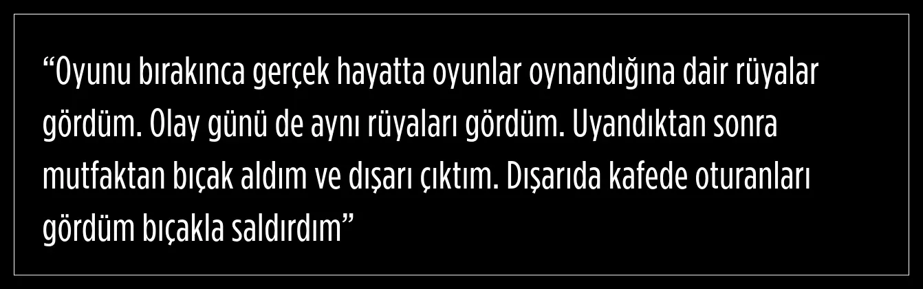 İfadesinde kimseyi özellikle ve bilerek hedef almadığını söyleyen şüpheli, oyunlarda olduğu gibi gerçek hayatta da insanların kendisine saldıracağını düşünerek onlara bıçakla saldırdığını iddia etti.