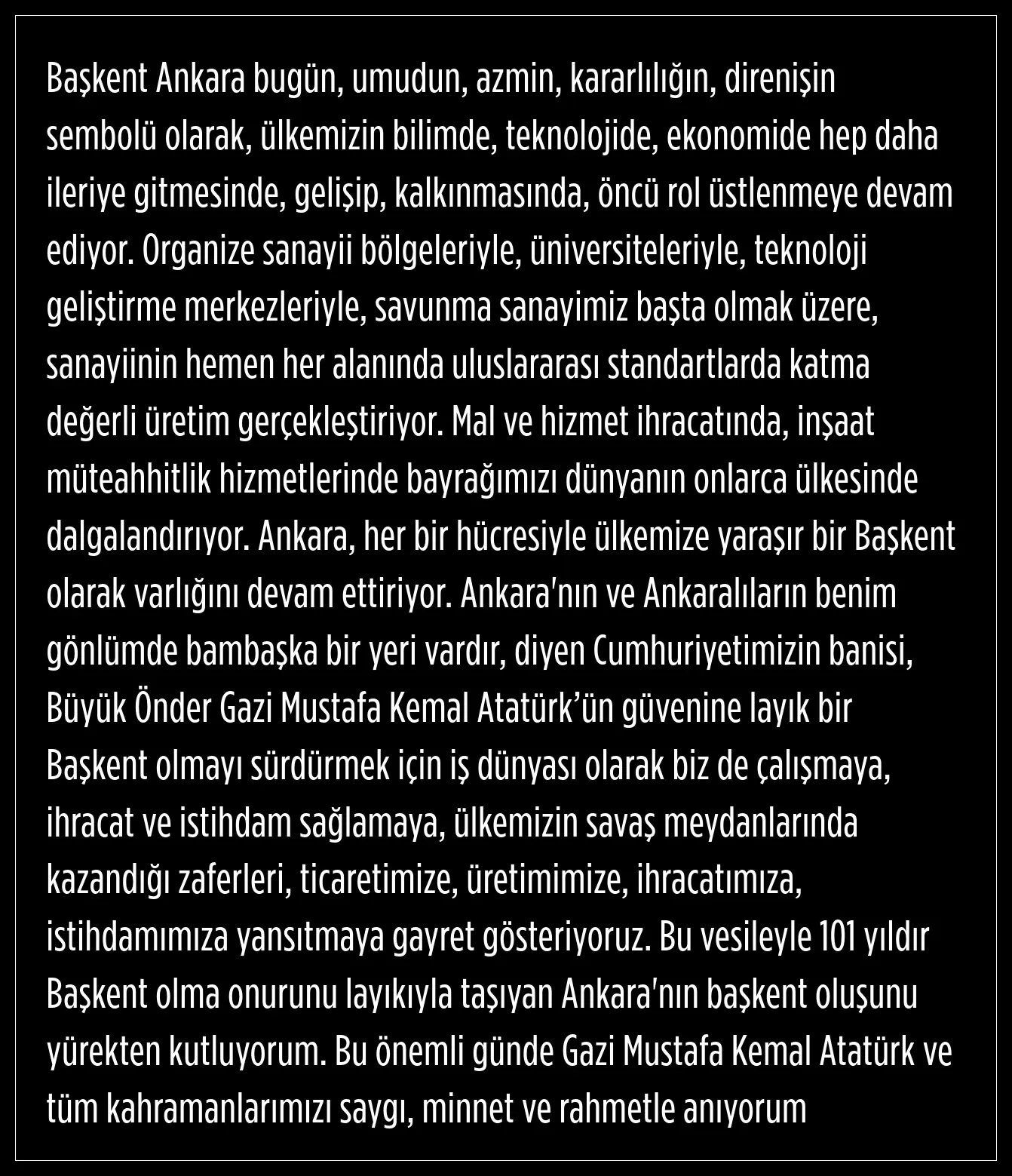 ATO Yönetim Kurulu Başkanı Gürsel Baran, 13 Ekim Ankara'nın Başkent Oluşunun yıl dönümü nedeniyle bir mesaj yayımladı.