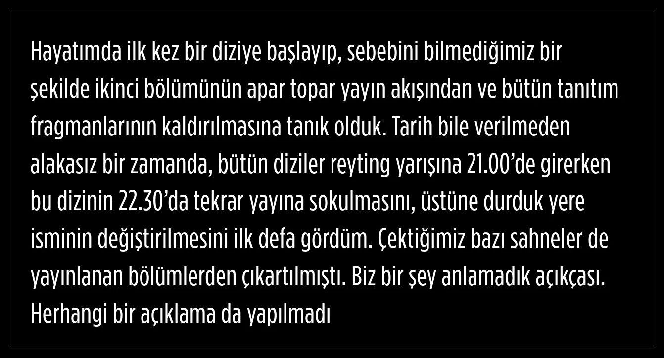 Cumhuriyet'te konuşan İlker Kaleli, hayatında ilk defa, sebebini bilmedikleri bir şekilde ikinci bölümünün apar topar yayın akışından ve bütün tanıtım fragmanlarının kaldırılmasına tanık olduklarını söyledi.