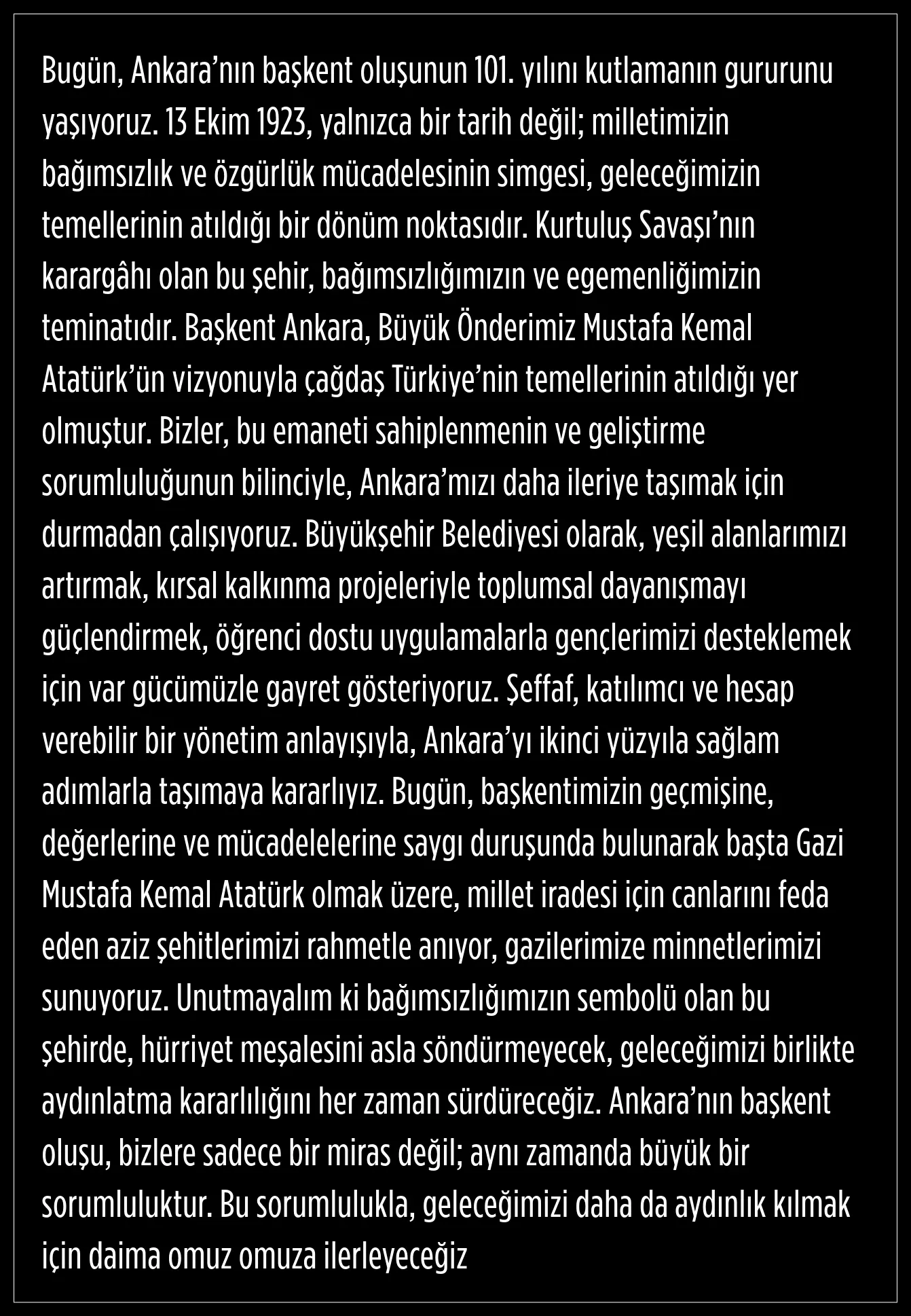 "Ankara’nın başkent oluşu, bizlere sadece bir miras değil; aynı zamanda büyük bir sorumluluktur"