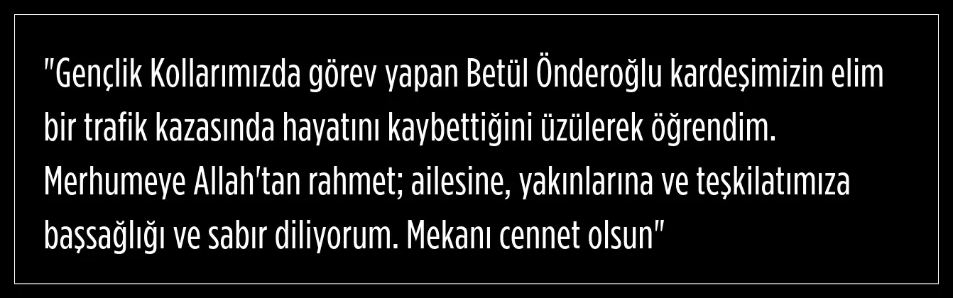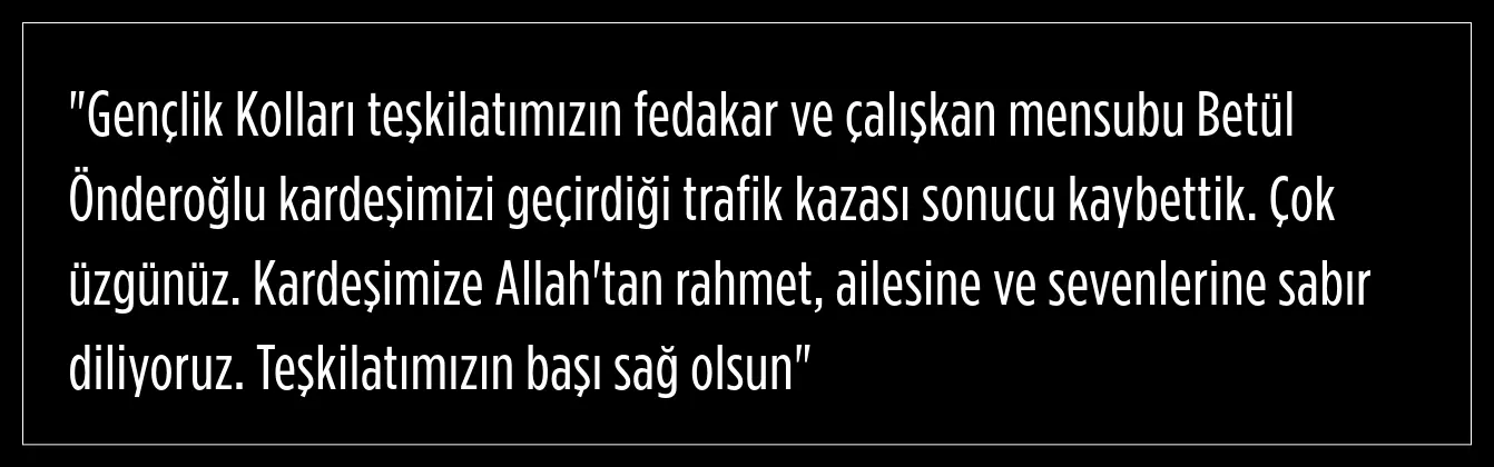 Ankara'da dün akşam otomobilin ağaca çarpması sonucu AK Parti Ankara İl Gençlik Kolları Yönetim Kurulu Üyesi Betül Önderoğlu yaşamını yitirdi.