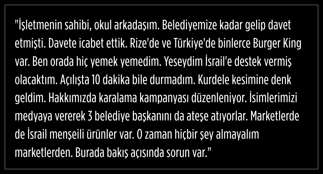 Rize'de İsrail'e destek verdiği gerekçesiyle dünya genelinde boykot uygulandığı bilinen Burger King'in Rize'deki şube açılışı gündem olmuştu. Artvin Çoruh Üniversitesi'nde Sanat Tasarım Fakültesi Öğretim Görevlisi Dr. Kemal Sağlam, söz konusu açılışa tepki göstermişti. "Kahrolsun İsrail" şeklinde slogan atan Sağlam, bunun üzerine birçok kişi tarafından darp edilmişti.