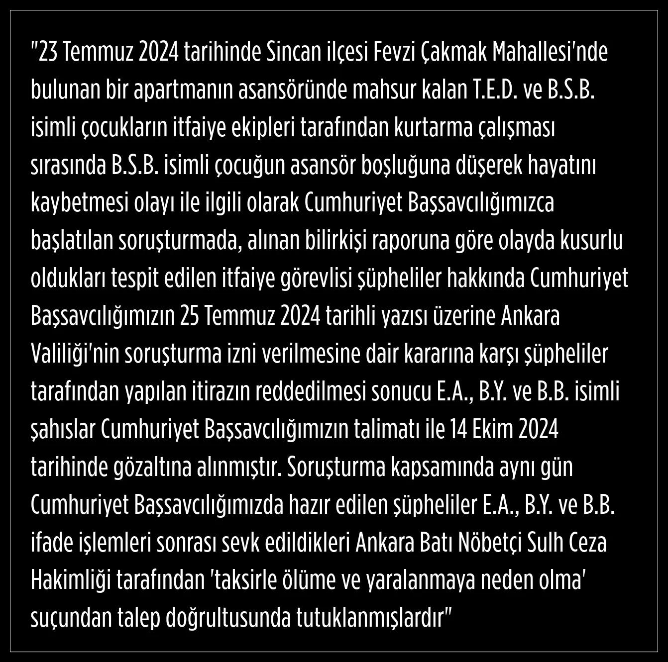 Ankara'daki kurtarma operasyonunda Beren Su Bolat'ın asansör boşluğuna düşerek ölümünde kusurlu bulunan 3 itfaiyeci tutuklandı.