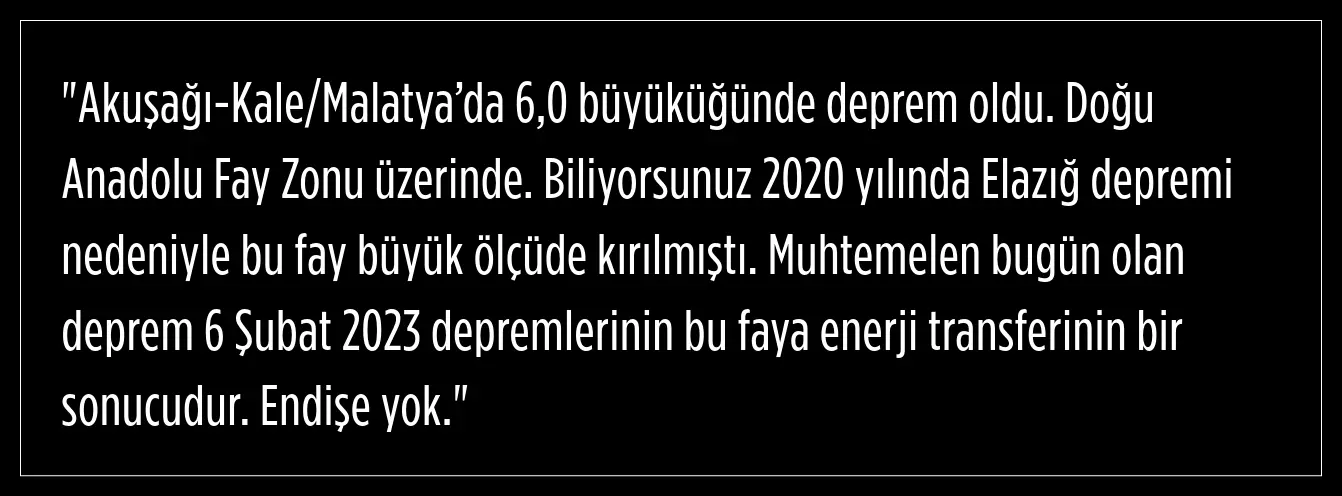 Bugün yaşanan depremin "Kahramanmaraş merkezli 6 Şubat depremlerinin Doğu Anadolu Fay Zonu'na enerji transferinin bir sonucu" olabileceği ihtimali üzerinde duran Görür, endişelenmeye gerek olmadığını belirterek vatandaşların içini rahatlattı.