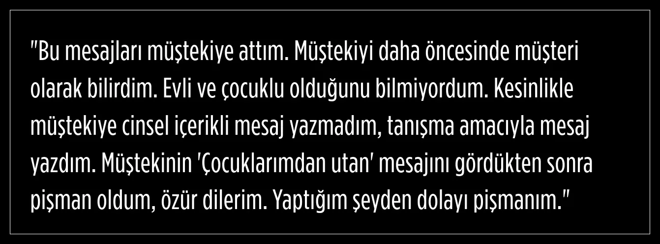 Savunmasında önceden de pişmanlığını dile getirdiğini ifade eden İbrahim Demir, Burçin B.'nin evli ve çocuklu olduğundan haberdar olmadığını belirterek kendisine cinsel içerikli değil tanışma amaçlı mesaj attığını ileri sürdü. Özür dileyen İbrahim Demir, şu ifadeleri kullandı: