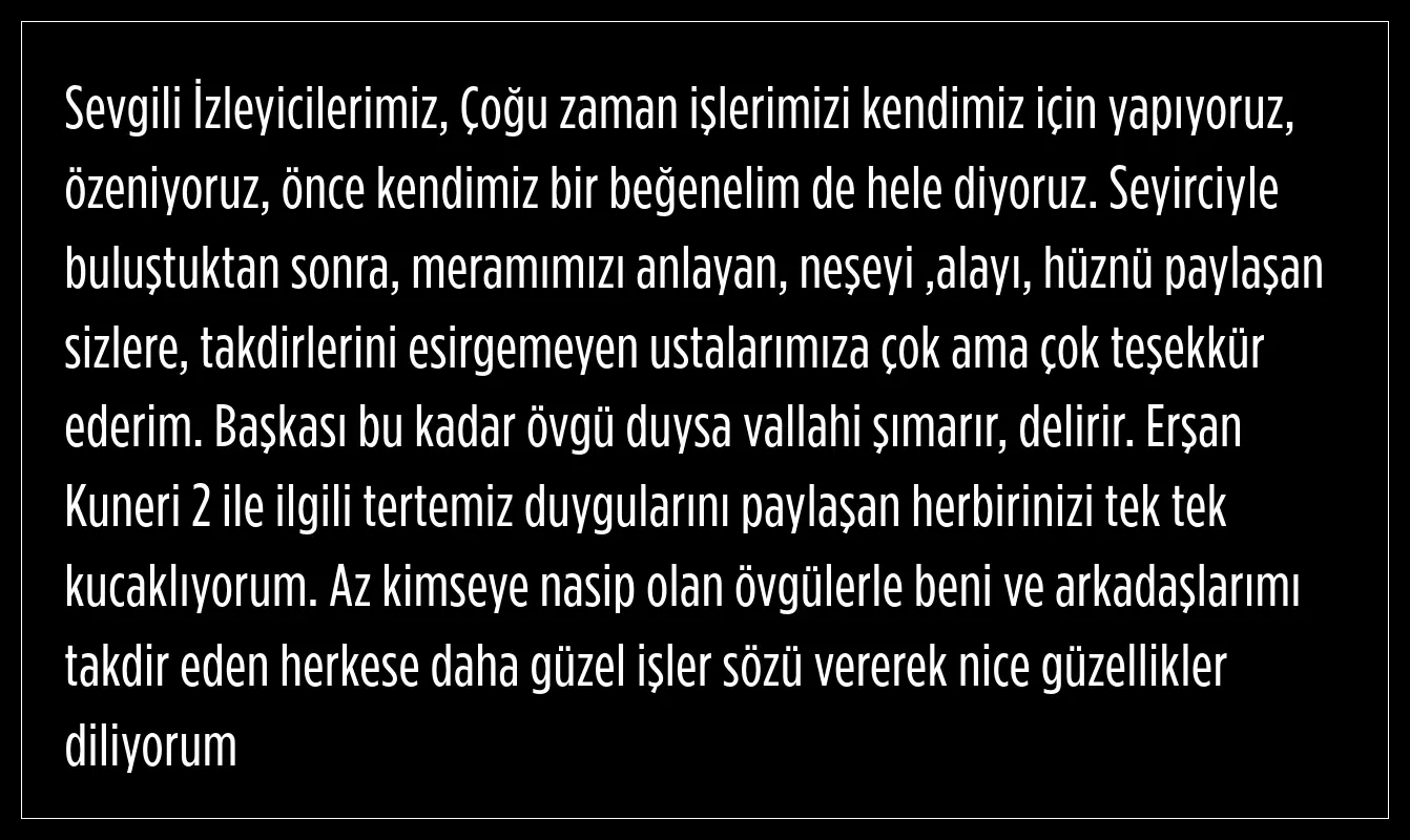 İzleyenler, "Çok güzel olmuş emeğinize sağlık", "Muhteşemdi "Erşan Kuneri 2 gerçekten çok güzel olmuş. Her ayrıntısına özendiğiniz dikkat ettiğiniz belli. Severek izledim", "Harikaydı tebrikler" tarzında yorumlarda bulundu.