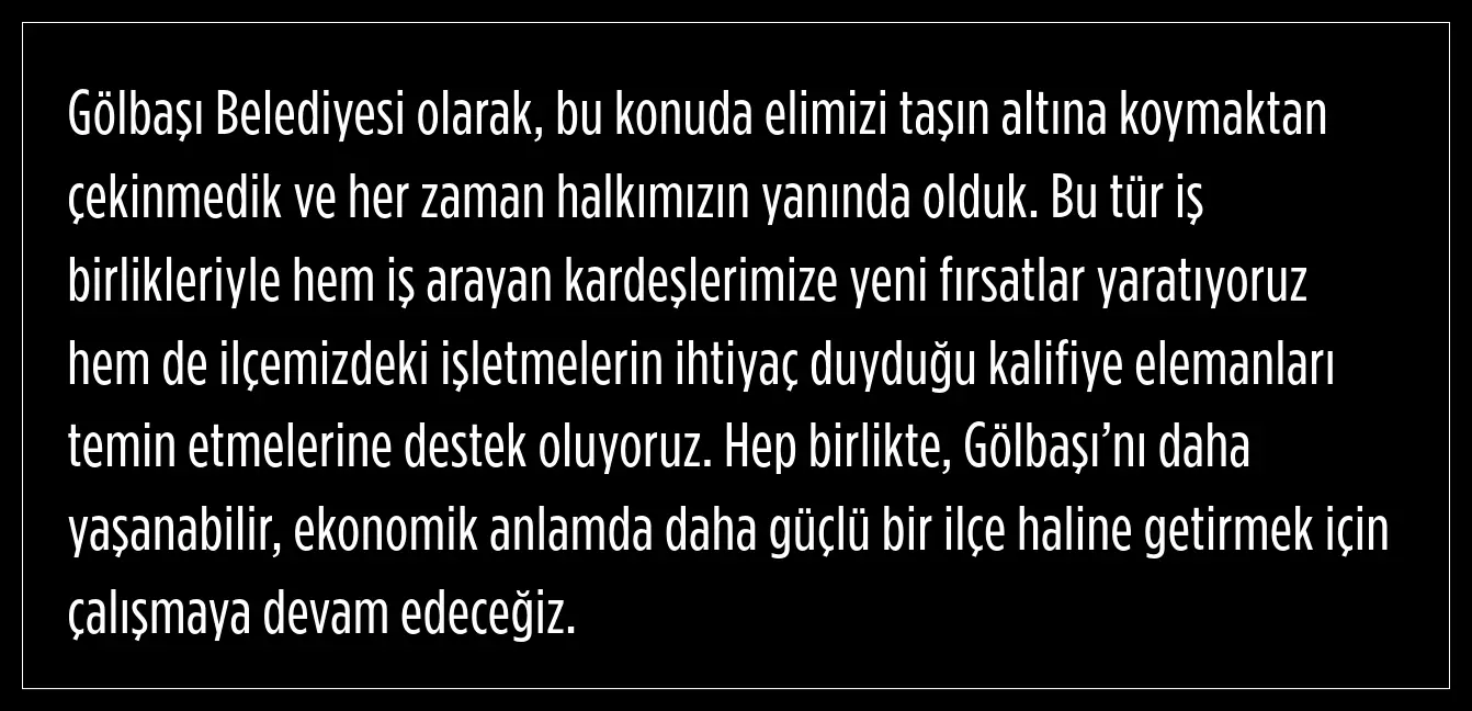 Gölbaşı Belediye Başkanı Yakup Odabaşı, Gölbaşı'nda işsizliği azaltmak ve vatandaşlara yeni iş imkanları sunmak için bu tür iş birliklerinin önemli olduğunu vurguladı.