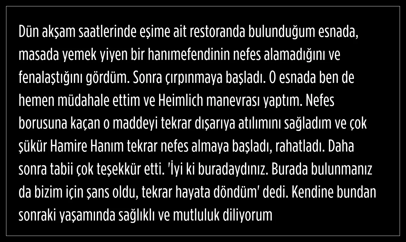 Ankara'nın Çankaya ilçesinde eski hakem Selçuk Dereli, yemek borusuna yemek kaçan kadını Heimlich manevrası ile kurtardı.