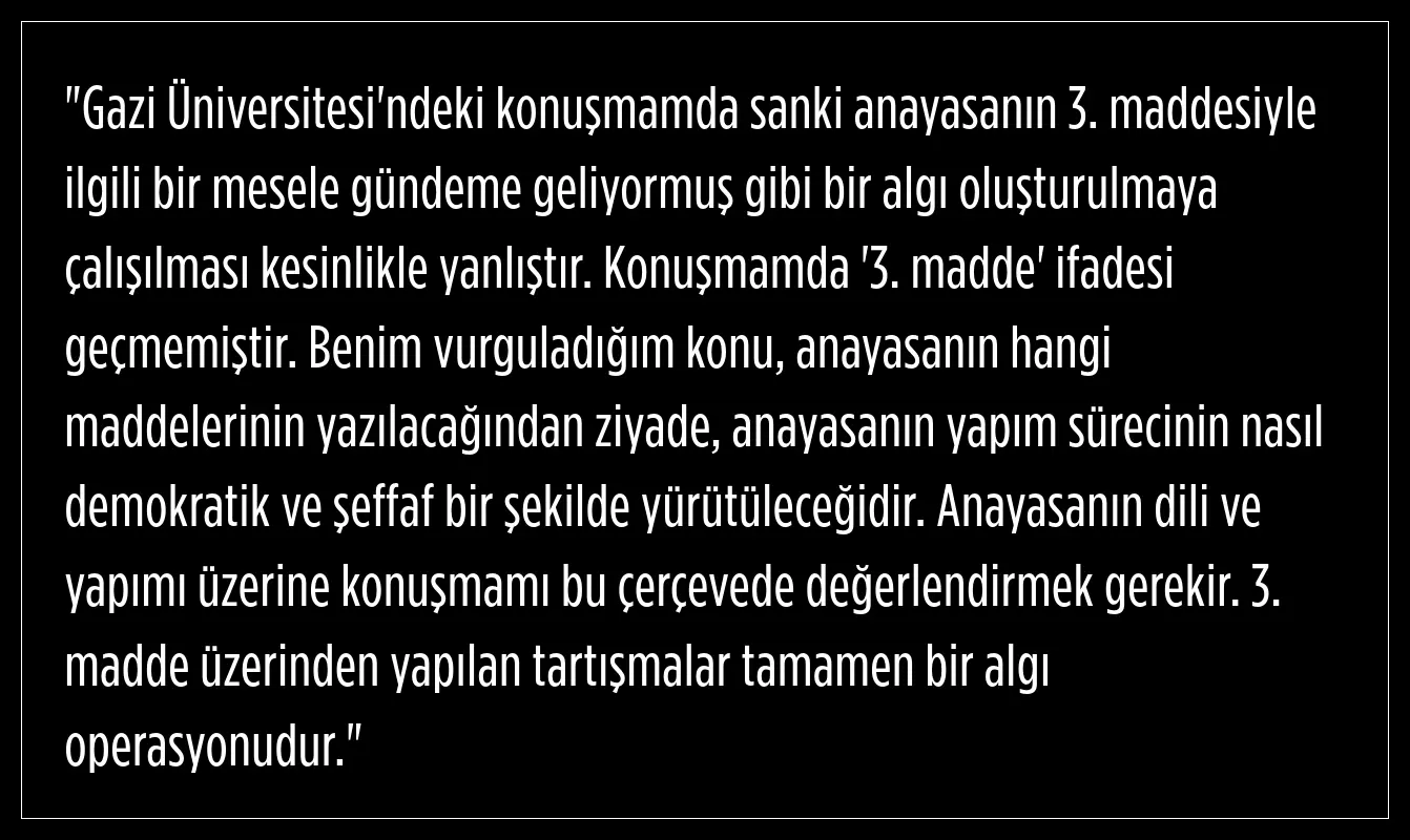 AK Parti Genel Başkanvekili Numan Kurtulmuş’un, anayasadaki "Devletin ülkesi ve milletiyle bölünmez bütünlüğü" ifadesine dair yaptığı açıklamalar geniş bir tartışma başlatmıştı. Kurtulmuş, bu ifadede değişiklik yapılması gerektiğini belirterek, "Devletin ülkesi olmaz. Devletin milleti olmaz. Bu metin, 'Milletin devleti ve ülkesiyle bölünmez bütünlüğü' şeklinde ifade edilmelidir" demişti.