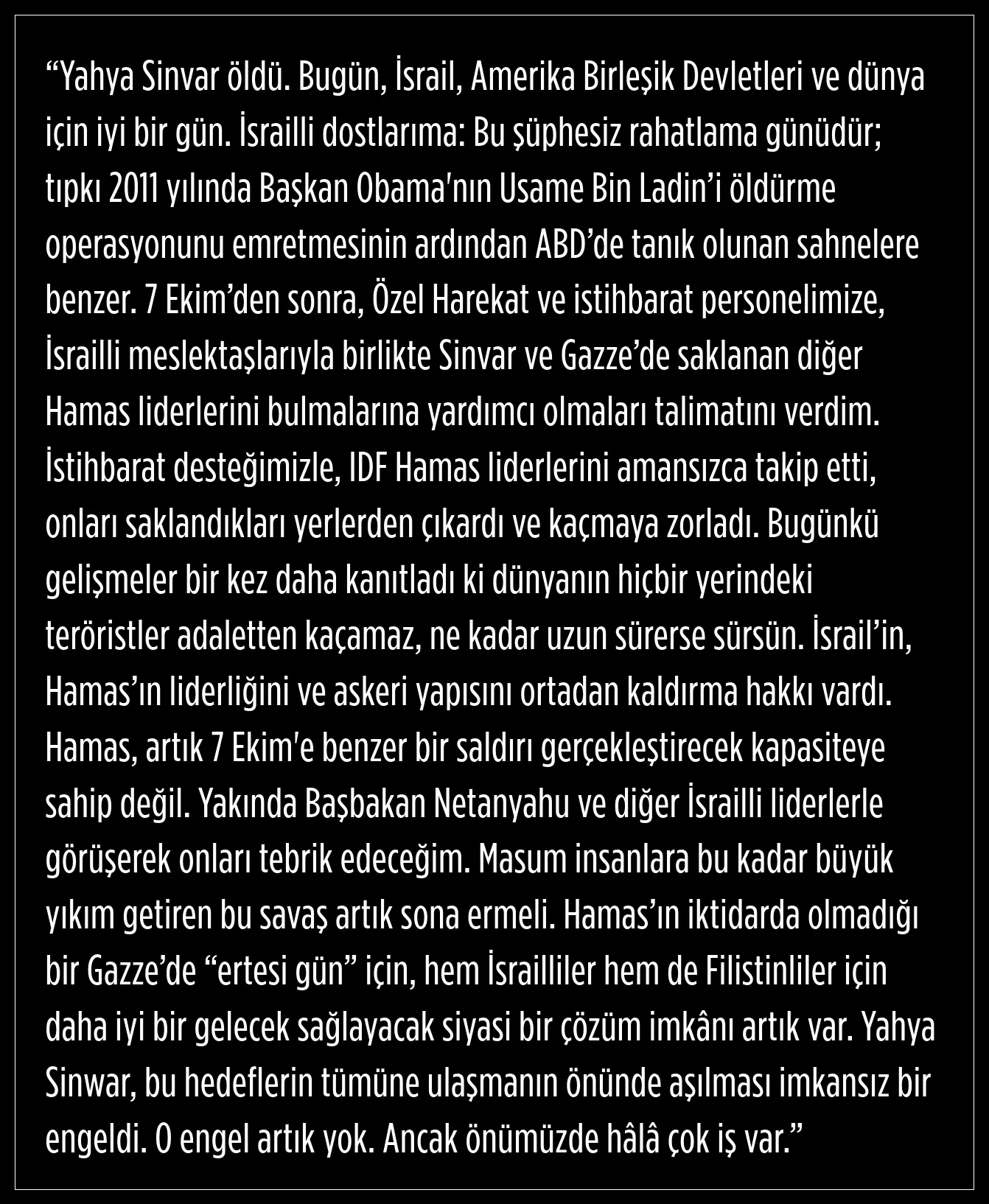 ABD Başkanı Joe Biden, Yahya Sinvar’ın ölümünü “Bugün, İsrail, Amerika Birleşik Devletleri ve dünya için iyi bir gün” sözleriyle yorumladı.