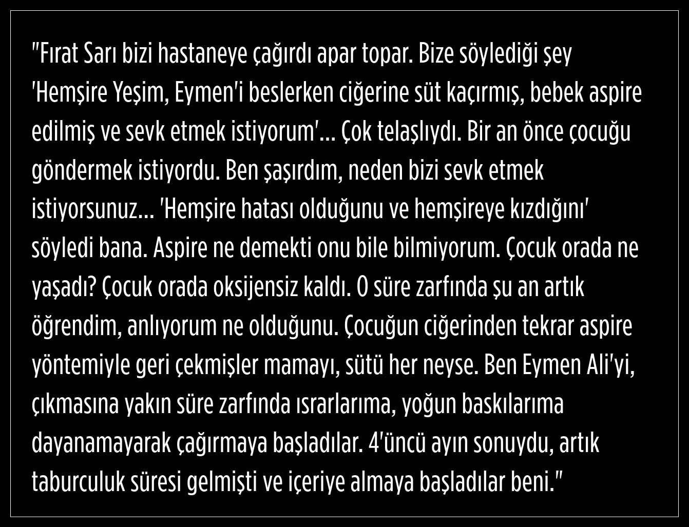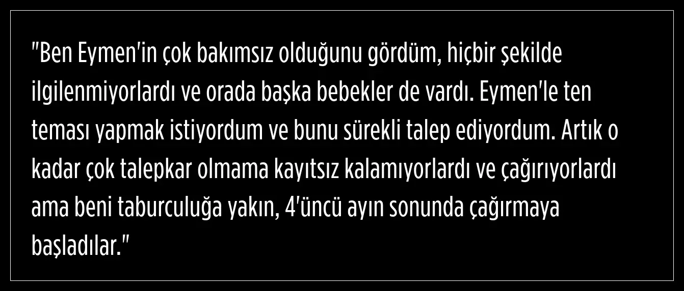 Ayşe K., bunun artık kuşku olmadığını ve şu anda 4 yaşında olan oğlunun ihmal nedeniyle engelli kaldığından emin olduğunu dile getirdi. Eymen'in ihmal ve bakımsızlık sebebiyle "hayatının karartıldığını" dile getiren Ayşe K., başından geçenleri tek tek anlattı.