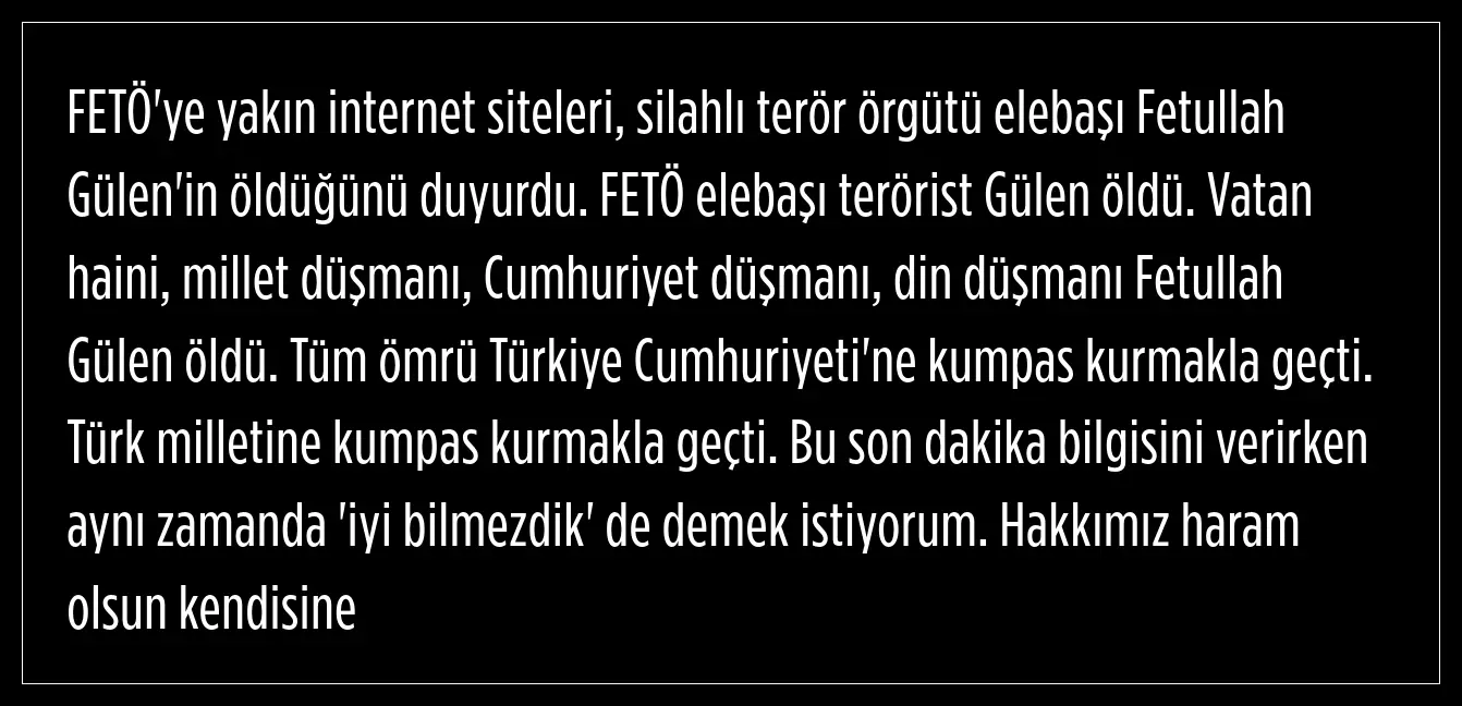Gülen, hayatını kaybetti. FETÖ'ye yakın hesaplar ve internet siteleri Fetullah Gülen'in ölüm haberini duyurdu.