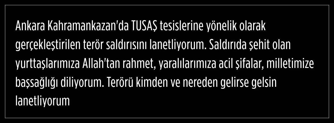 Ankara Kahramankazan tesislerine yönelik olarak gerçekleştirilen hain terör saldırısını lanetliyor; şehitlerimize Allah’tan rahmet, yaralılarımıza acil şifalar diliyorum. Türkiye Cumhuriyeti, teröre ve terörün arkasındaki şer odaklarına gereken cevabı mutlaka vermelidir!)