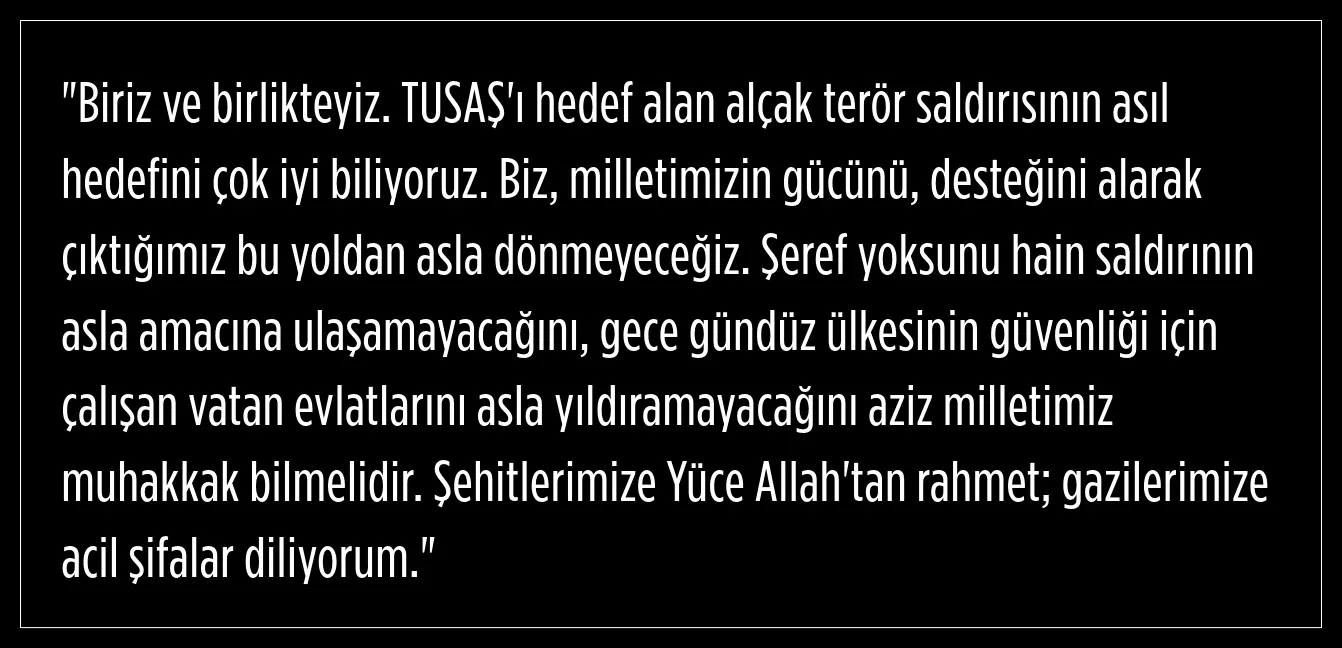 Savunma Sanayii Başkanı (SSB) Prof. Dr. Haluk Görgün, Türk Havacılık ve Uzay Sanayii Anonim Şirketinin (TUSAŞ) Kahramankazan tesislerine yönelik terör saldırısına ilişkin yayımladığı mesajda, şunları kaydetti: