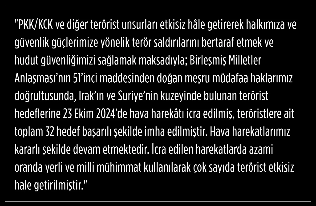 MSB TUSAŞ'a yönelik terör saldırısının ardından yaptığı açıklamada Suriye ve Kuzey Irak'ta PKK'ya ait 32 hedefin imha edildiğini açıkladı.