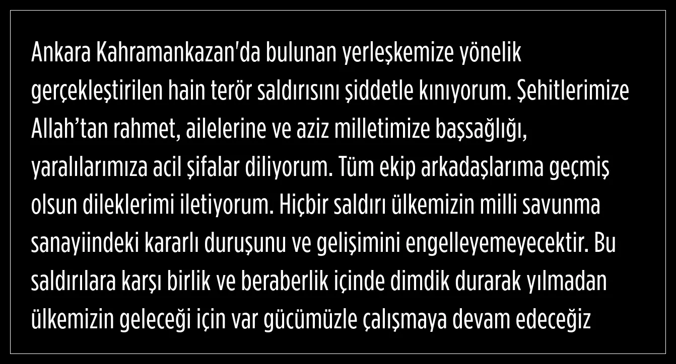 TUSAŞ Genel Müdürü Mehmet Demiroğlu, Ankara'daki saldırıya ilişkin açıklama yaptı. Demiroğlu, saldırıyı şiddetle kınadığını ifade etti.