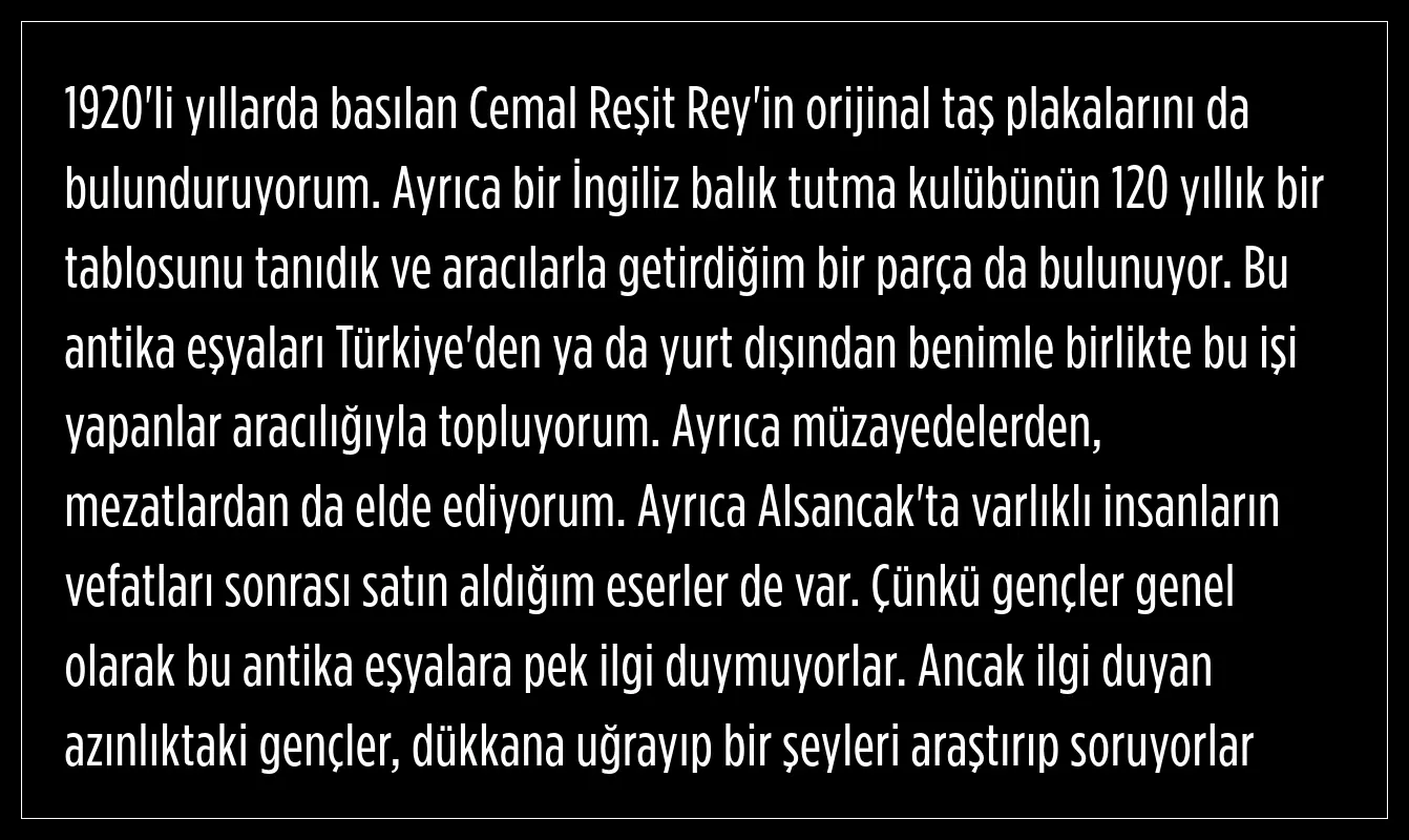 Thomas Edison'un 1877 yılında Amerika'da ürettiği ilk müzik aleti olan gramofonu dükkanında bulundurduğunu belirten Hitay, çok değerli olan Osmanlı dönemine ait olan ve İngiltere, Fransa'da, Grafson Plak gibi markalara yaptırılmış taş plakların mevcut olduğunu söyledi.