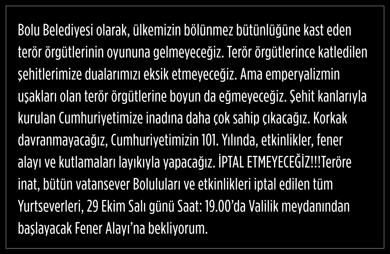 Özcan, 29 Ekim Cumhuriyet Bayramı'nın 101'inci yılında düzenlenecek etkinlikler kapsamında tüm Bolu halkını etkinliğe davet etti.