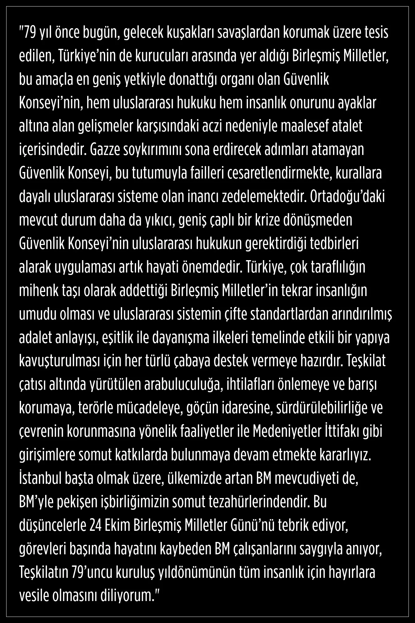 Teşkilatı’nın 79’uncu kuruluş yıldönümü vesilesiyle BM Genel Sekreteri ve BM çalışanlarını tebrik ediyorum. Gazze ve diğer çatışma bölgelerinde hayatını kaybeden BM görevlilerinin sayısının rekor düzeylere ulaştığı, barışı koruma misyonlarına saldırıldığı, Genel Sekreteri’nin “istenmeyen adam” dahi ilan edildiği bu günlerde Teşkilat, kuruluş yıldönümünü maalesef buruk bir şekilde idrak ediyor. Oysa, dünyanın dört bir yanındaki çatışmaların meydana getirdiği yıkım, giderek genişleyen ve derinleşen açlık ve yoksulluk hâli, dünyayı zehirli bir şekilde saran İslam ve yabancı düşmanlığı ile ırkçılık, Birleşmiş Milletler’e düşen görev ve sorumluluğu her geçen gün daha da arttırmaktadır. Bu sorumluluğun layıkıyla ifası, ancak Birleşmiş Milletler’in Güvenlik Konseyi dâhil tüm temel organlarının işlevlerini yerine getirebilecekleri uygun şartların sağlanmasıyla mümkün olabilir.")
