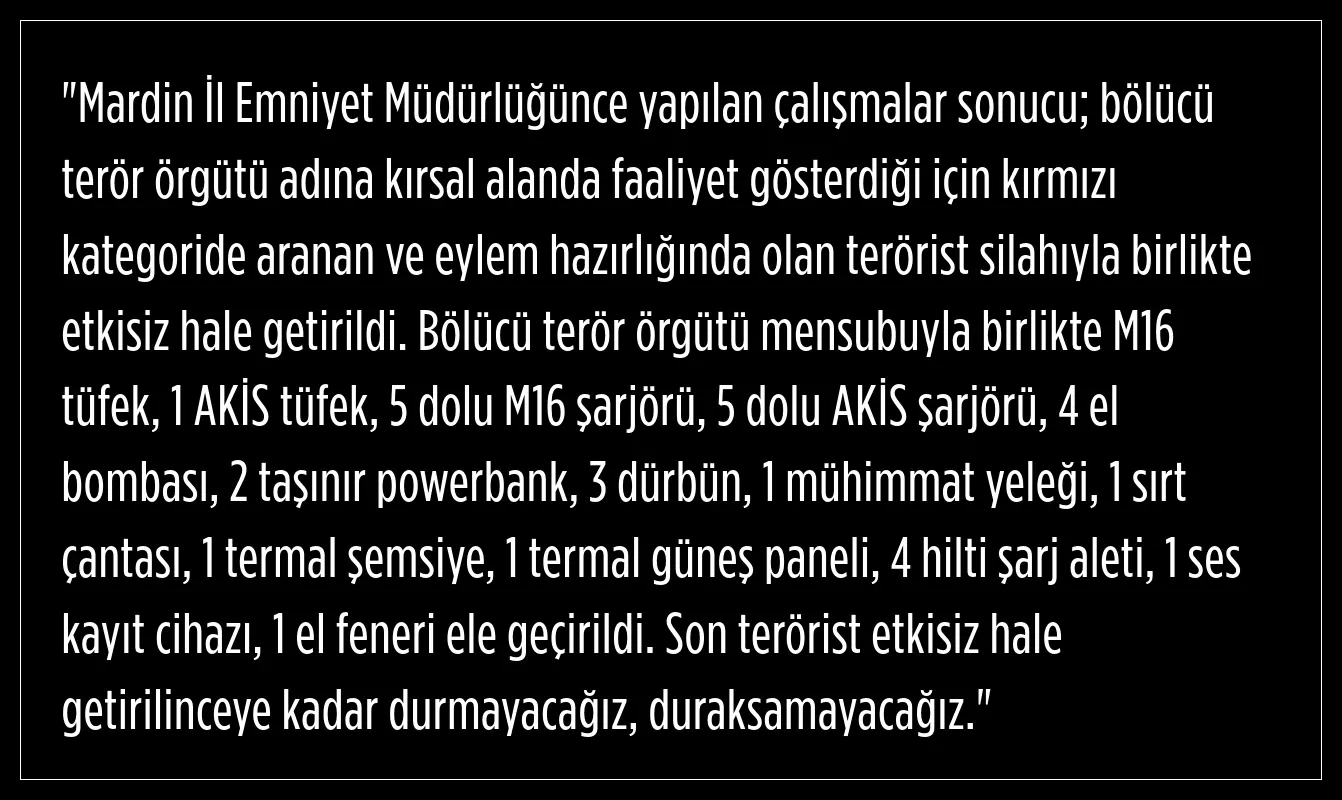 İçişleri Bakanı Ali Yerlikaya duyurdu. Kırmızı bültenle aranan PKK/KCK'lı terörist Ramazan Aktaş, Mardin'de yapılan operasyonla etkisiz kılındı.