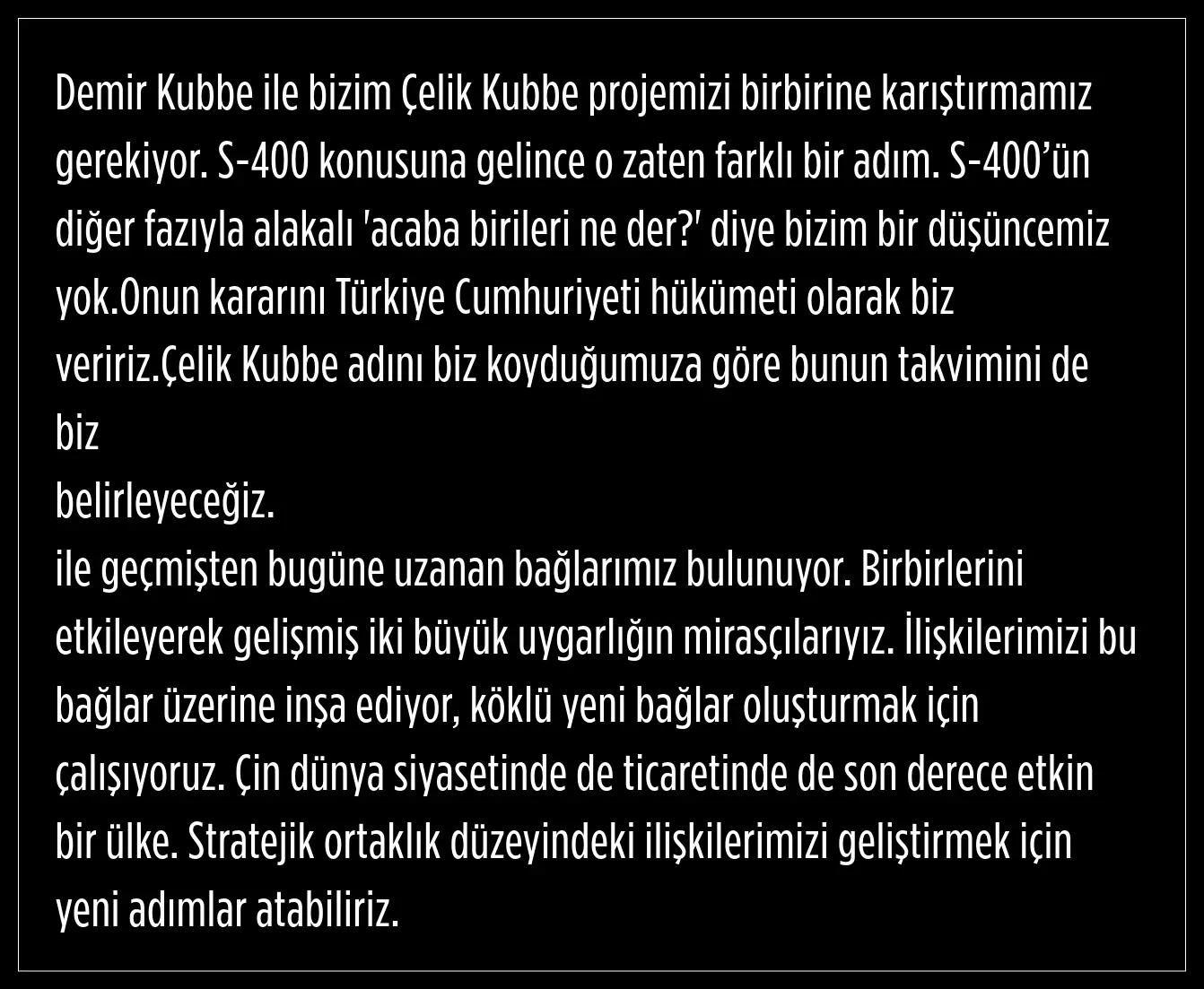 Cumhurbaşkanı son olarak, Çelik Kubbe, S-400 ve Çin ile ilgili ilişkileri değerlendirdi.