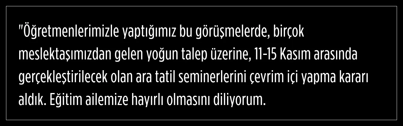 Diğer yandan 11-15 Kasım tarihleri arasında yapılacak ilk ara tatilde öğretmenlerin ara tatil semineri online yapılacak.