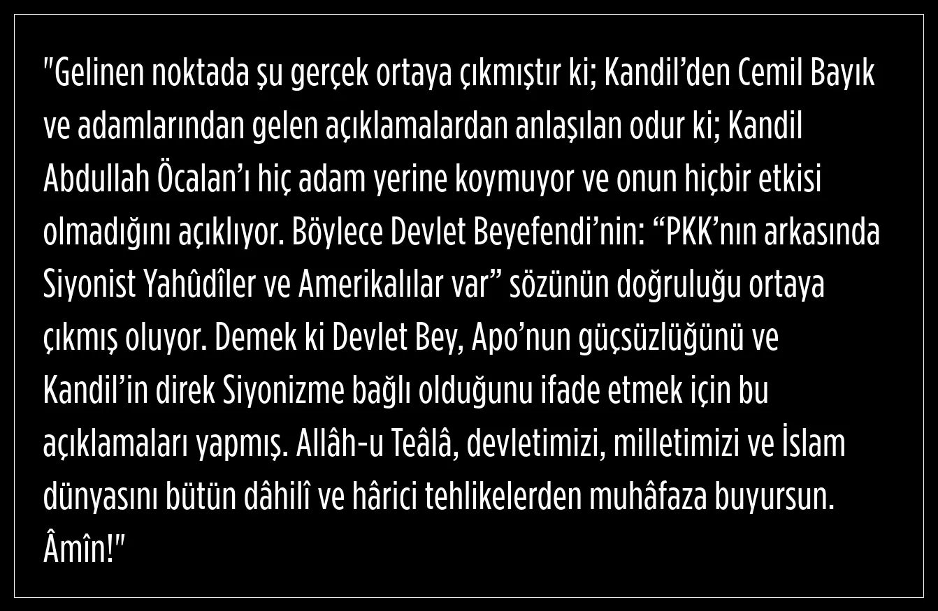 Cübbeli Ahmet Hoca, görüşmenin ardından sosyal medya hesabından açıklamalarda bulundu. Ünlü, paylaşımında, Kandil’den gelen açıklamalarda, Cemil Bayık ve diğer PKK liderlerinin Abdullah Öcalan’ın etkisiz olduğunu belirttiğine dikkat çekti. Bu bağlamda, MHP Genel Başkanı Devlet Bahçeli’nin, “PKK’nın arkasında Siyonist Yahudiler ve Amerikalılar var” ifadesinin doğruluğunun görüldüğünü ifade etti.