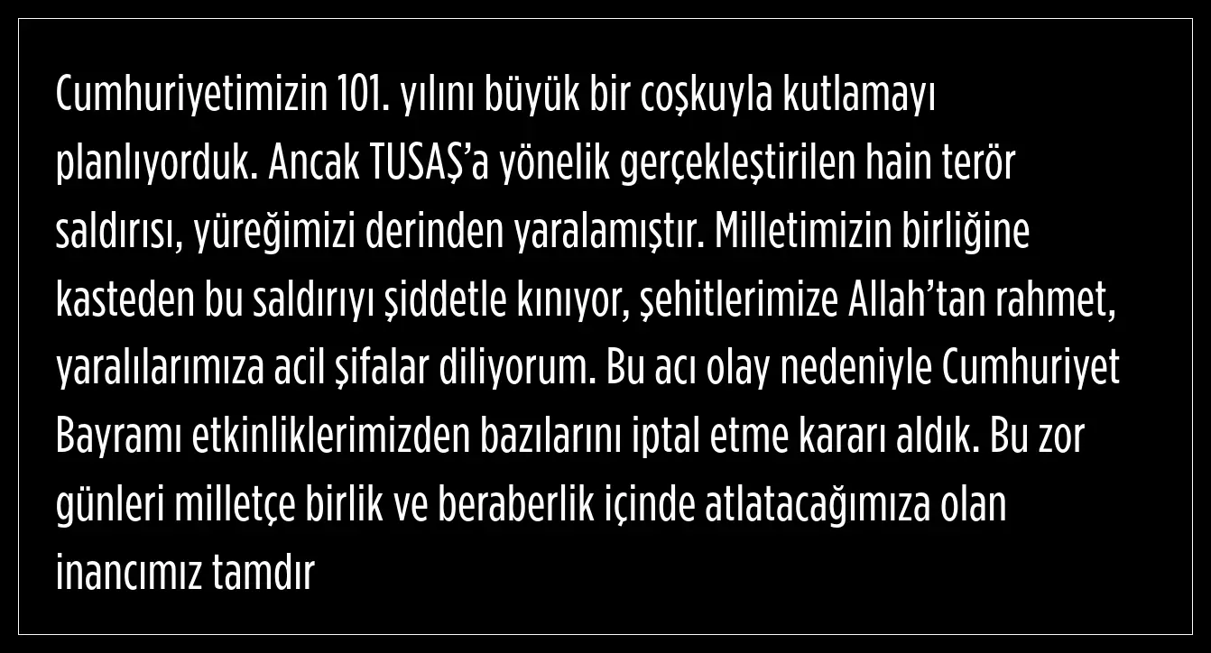 Etkinliklerin iptal edilmesiyle ilgili Yakup Odabaşı, Cumhuriyetin 101. yılını büyük bir coşkuyla kutlamayı planladıklarını ancak TUSAŞ’a yönelik gerçekleştirilen hain terör saldırısının yürekleri derinden yaraladığını ifade etti.