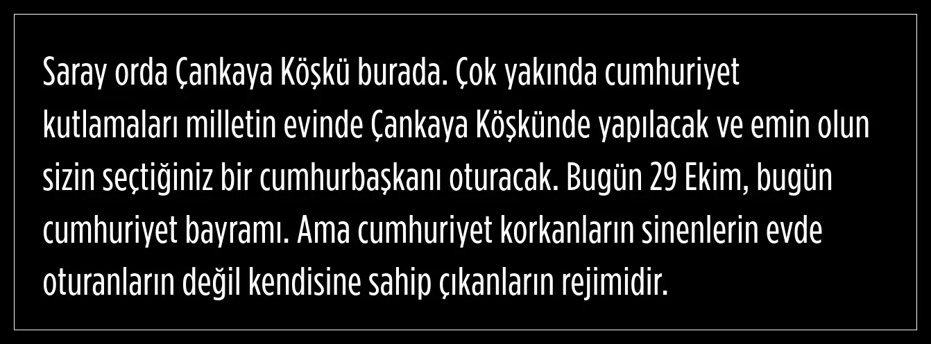 Vatandaşlara seslenen Özeli Türkiye'nin tarihi bir kavşakta olduğunu ifade etti. Türk gençlerinin umutsuzluktan yurt dışına gittiklerini söyleyen CHP Lideri gençlere seslenerek, "Atatürk cumhuriyeti ne orduya ne partiye ne siyasete emanet etti, siz gençlere emanet etti." dedi.