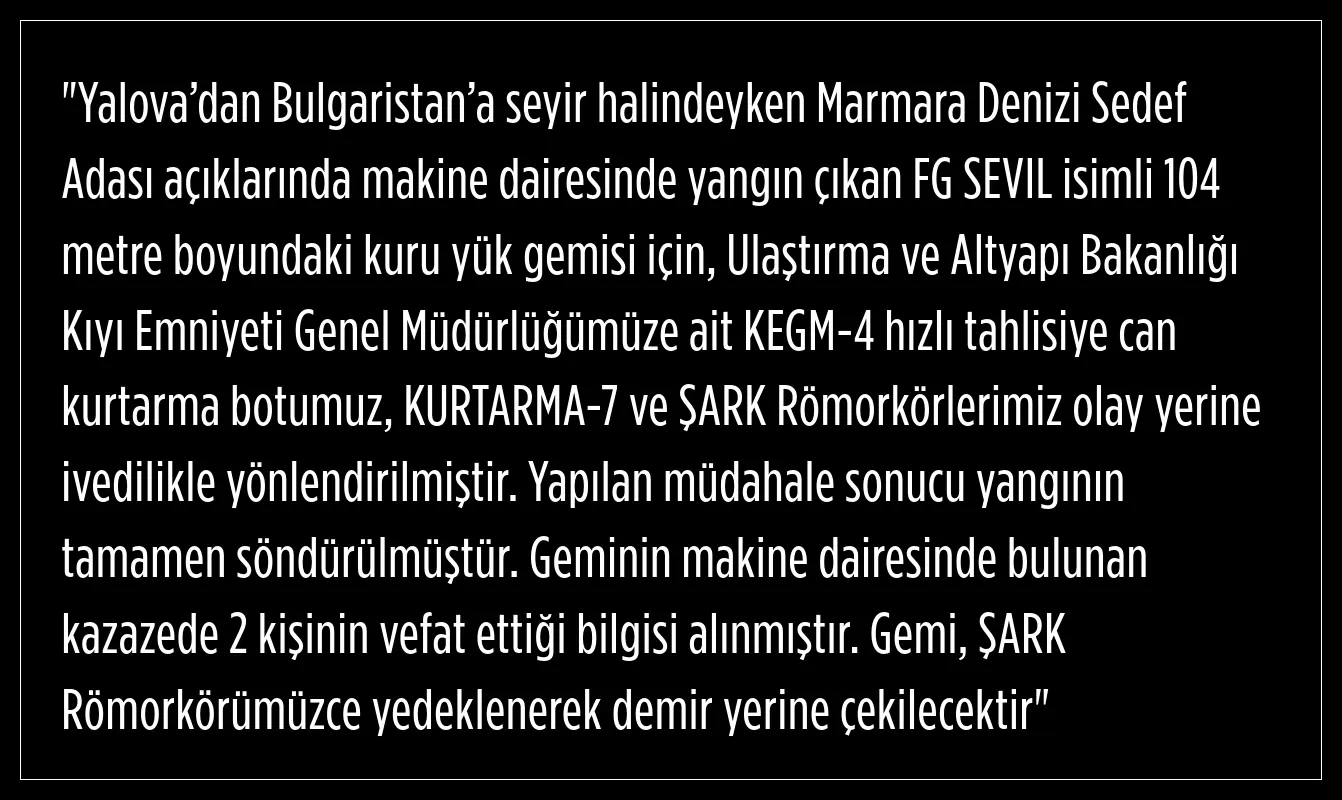 Yalova'dan Bulgaristan'a giden kuru yük gemisinde yangın çıktı. Makine dairesinde mahsur kalan iki işçi hayatını kaybetti.