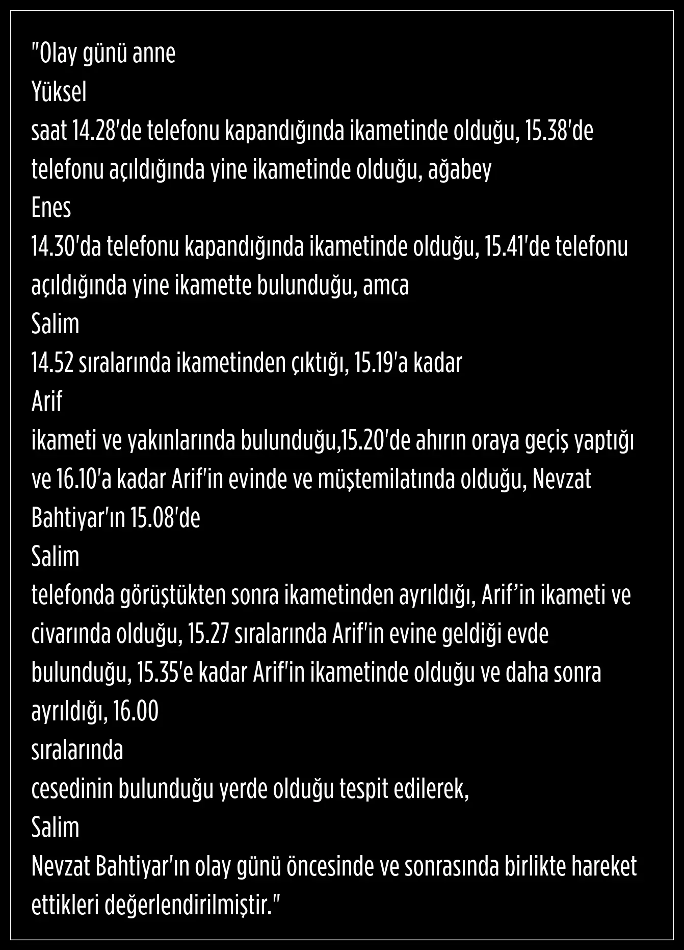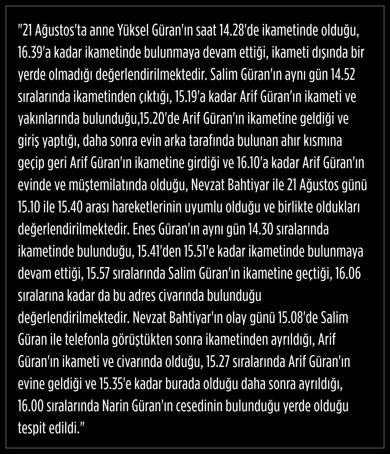 Diyarbakır 8. Ağır Ceza Mahkemesi’nce kabul edilen iddianamede de HTS kayıtlarına yer verildi. İddianamede, anne Yüksel Güran’ın olay günü saat 14.28-15.38 arası ikametinde olduğu, ağabey Enes Güran’ın 14.30-15.41’de ikametinde bulunduğu, amca Salim Güran ve Nevzat Bahtiyar’ın olay öncesi ve sonrası birlikte hareket ettikleri değerlendirilerek dava açıldı.
