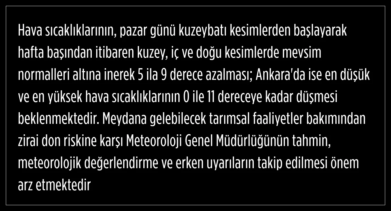Öte yandan Ankara'da pazar gününden itibaren havalarda ciddi düşüşler yaşanacak.