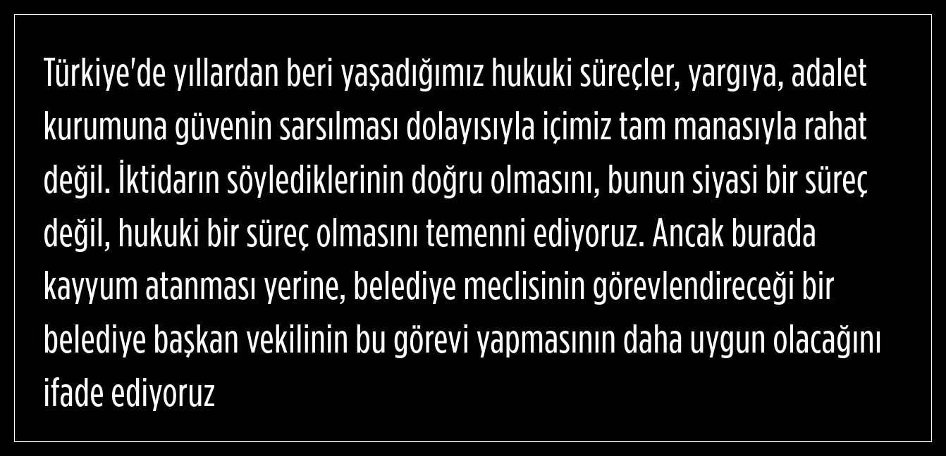 Kayyum atanmasına ilişkin Erbakan, kayyum atanmasına yerine belediye meclisinin görevlendireceği bir belediye başkan vekilinin bu görevi yapmasının daha uygun olacağını ifade ettiklerini belirtti.