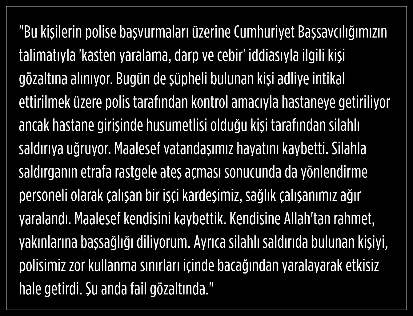 Saldırganın çevreye rastgele ateş açması sonucu, hastanede yönlendirme personeli olarak görev yapan bir sağlık çalışanı da ağır yaralandı.