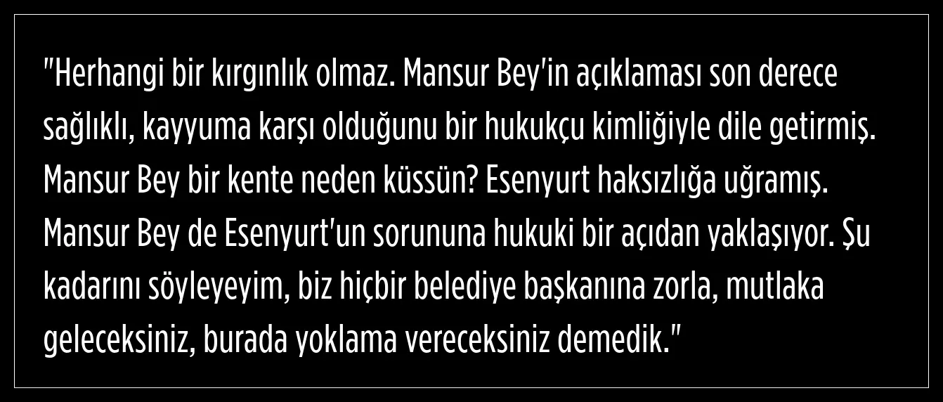 Ankara Büyükşehir Belediye Başkanı Mansur Yavaş'ın, Özer'e destek amacıyla düzenlenen Esenyurt mitingine katılmaması ve bu durumun aralarında bir kırgınlık olup olmadığı sorusuna yanıt veren Özel, şunları söyledi: