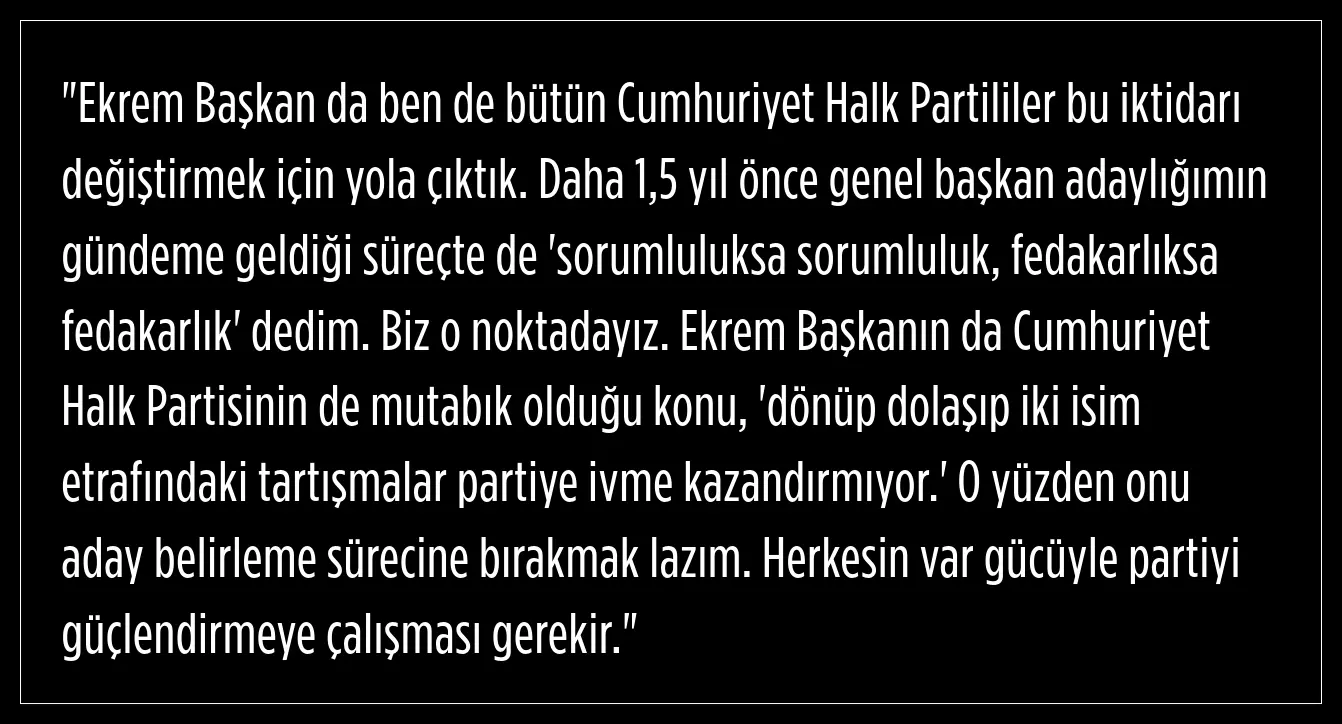Cumhurbaşkanlığı adaylığı ile ilgili konuşmaları doğru bulmadığını belirten İBB Başkanı Ekrem İmamoğlu'nun açıklamalarının önemli olduğunu kaydeden CHP lideri, şu ifadeleri kullandı: